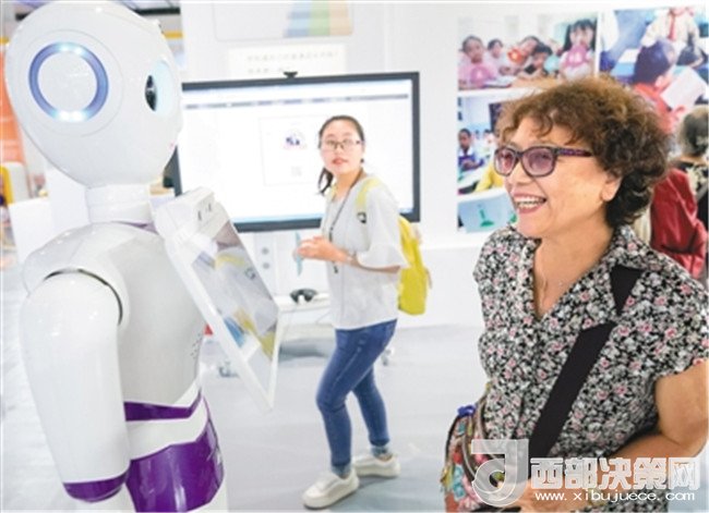 在首屆中國北京國際語言文化博覽會上,一名參觀者與智能客服機器人交流。   (新華社記者 沈伯韓 攝)
