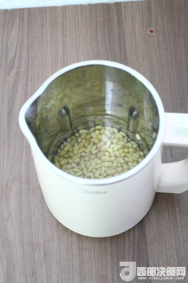 2、將浸泡過后的黃豆撈出放進(jìn)豆?jié){機(jī)桶中,加入適量的水(以最低水位為準(zhǔn))。