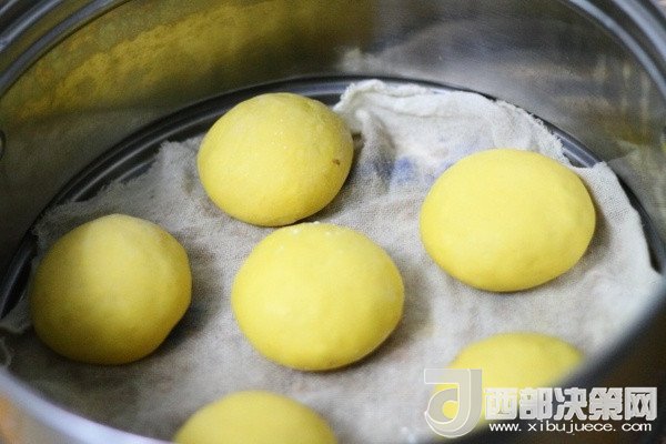 7、重復上述步驟做剩余的蜜豆包,全部做完后放蒸鍋中放置10—15分鐘左右,煤氣灶開火燒水,待水燒開后將蜜豆包放上去蒸15分鐘左右關火。