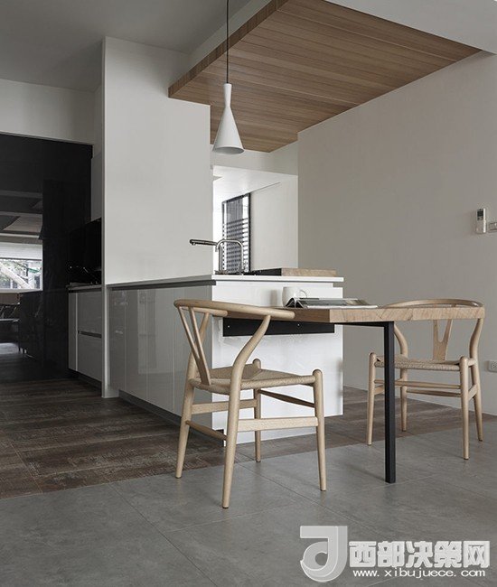 將洗手臺(tái)放在中間的位置,配上組合的簡(jiǎn)易餐桌,不做吧臺(tái)的設(shè)計(jì)也能滿足開放式的需求,在家下廚較少的業(yè)主可以考慮。