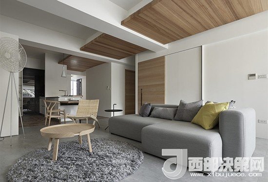 站在長(zhǎng)廊一頭視線忍不住會(huì)跟著木質(zhì)頂板向前眺望,一直延伸至窗外,室外的采光經(jīng)過漫反射幾乎可以引入整個(gè)客廳。