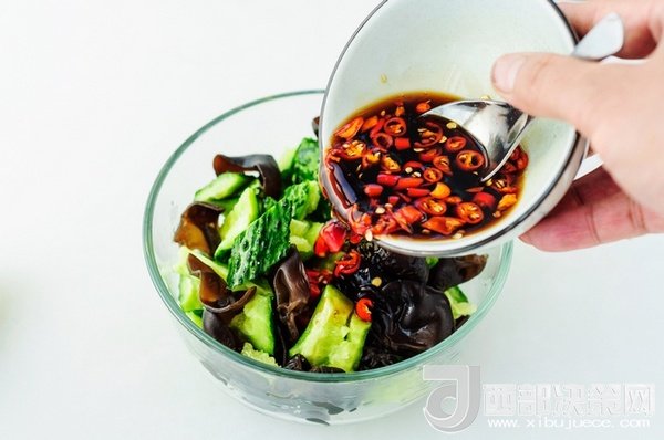 5、把處理好的黃瓜黑木耳盛到小碗里,澆進(jìn)調(diào)好的味汁拌勻,腌漬10分鐘入味即可食用。