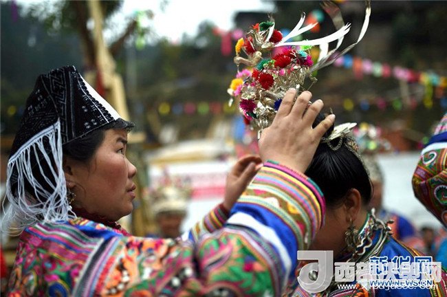 1月18日,在榕江縣仁里鄉(xiāng)仁吉侗寨,苗族婦女為同伴佩戴頭飾。記者戴天放攝