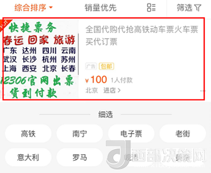 1月30日下午,人民網IT頻道在某著名電商平臺搜索“火車票代購”,在首屏也能搜到疑似黃牛的賣家,其廣告圖片里就有“春節(jié)回家、12306官網出票”等字樣,標價為100元,與這篇報道的黃牛加價情況基本一致。