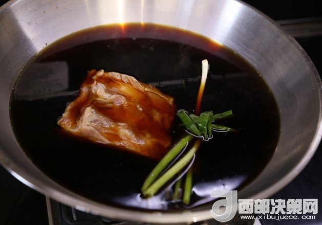 4.鍋里加入適量水,放入蔥結(jié),加入適量老抽,放入五花肉煮半小時(shí)左右。