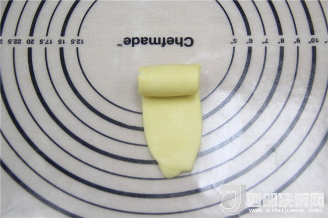 18.油酥面團(tuán)直立放著,然后用搟面杖搟成長條橢圓。