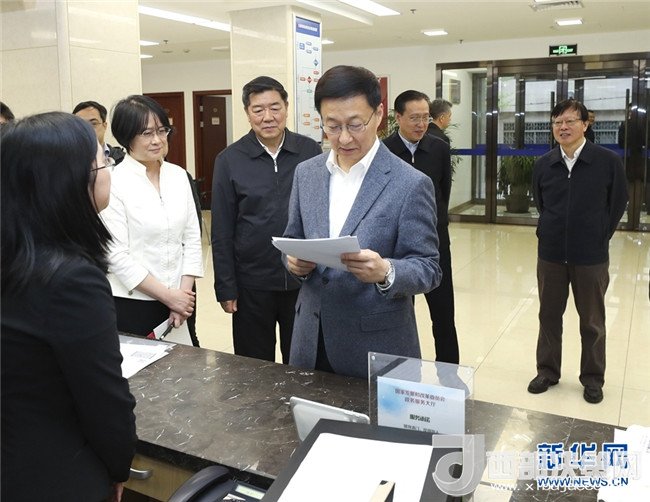 4月3日,中共中央政治局常委、國務(wù)院副總理韓正到國家發(fā)展改革委調(diào)研并主持召開座談會(huì)。這是韓正在國家發(fā)展改革委政務(wù)服務(wù)大廳考察。新華社記者 龐興雷 攝