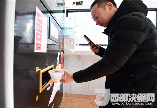在位于西安曲江創(chuàng)客大街邊的一家無人面館內,市民用手機拍攝機器剛做好的面食(1月10日攝)。新華社記者 邵瑞 攝