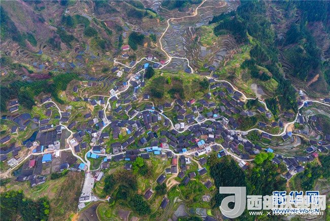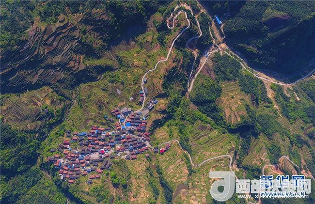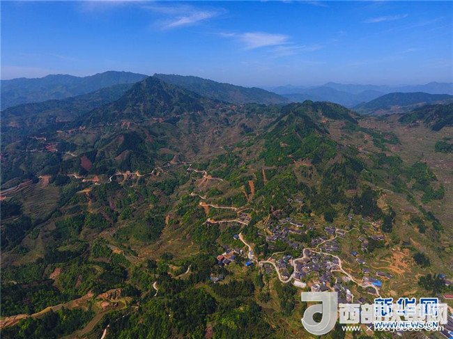 這是借助無人機拍攝的融水苗族自治縣桿洞鄉(xiāng)黨鳩村公路(4月17日攝)。
