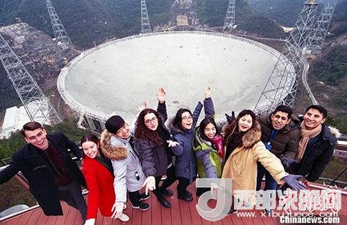 資料圖:留學(xué)生在FAST觀景臺合影留念。中新社記者賀俊怡攝