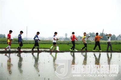 4月21日,四川省綿陽市迎新鄉(xiāng)小學(xué)足球隊(duì)的隊(duì)員們走在鄉(xiāng)間的田埂上,周末即使沒有訓(xùn)練,他們也會(huì)約著一起玩球。