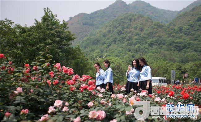 來自成都的大學(xué)生在位于四川綿竹市的“中國玫瑰谷”游覽拍照(4月18日攝)。新華社記者 張帆 攝