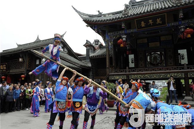 演員在汶川縣水磨鎮(zhèn)萬年臺進(jìn)行民俗表演(2012年5月23日攝)。新華社發(fā)(王飛 攝)