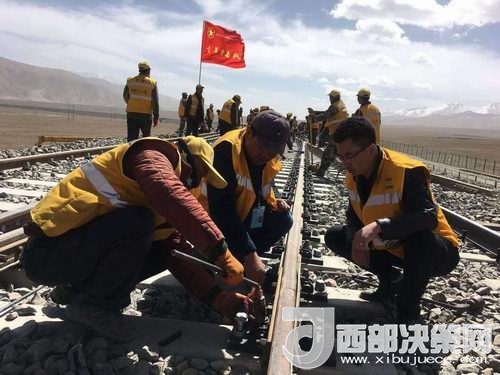 在玉珠峰車站施工現(xiàn)場,600余名工人正在緊張的進行螺紋道釘錨固定、搗道石、安裝枕木連接板等操作。橘黃色的工作服在遠(yuǎn)處皚皚雪山的映照下分外醒目和溫暖。中鐵二十一局格拉擴能改造工程指揮部總工李先告訴記者:“這個車站的改造由車站北側(cè)增加2條到發(fā)線,在車站的西側(cè)增加3股道的專用裝卸線。涉及到路基、橋涵、房建、軌道、通信、信號、電力7個專業(yè)。”