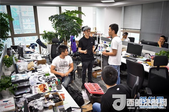 在深圳科技園的大疆創(chuàng)新總部,民用無人機領(lǐng)軍者汪滔(中)參與研發(fā)人員的討論(2015年5月22日攝)。新華社記者毛思倩攝