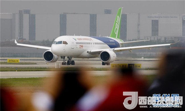 中國首款國際主流水準(zhǔn)的干線客機(jī)C919在上海浦東國際機(jī)場首飛成功(2017年5月5日攝)。新華社記者方喆攝