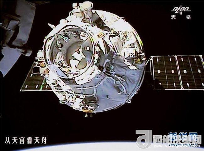 2017年4月22日12時(shí)23分,天舟一號(hào)與天宮二號(hào)順利完成自動(dòng)交會(huì)對接。這是天舟一號(hào)與天宮二號(hào)進(jìn)行的首次自動(dòng)交會(huì)對接,也是我國自主研制的貨運(yùn)飛船與空間實(shí)驗(yàn)室的首次交會(huì)對接。圖為北京航天飛行控制中心大廳大屏幕上顯示的天舟一號(hào)向天宮二號(hào)靠攏的畫面(2017年4月22日攝)。新華社發(fā)(王泗江 攝)