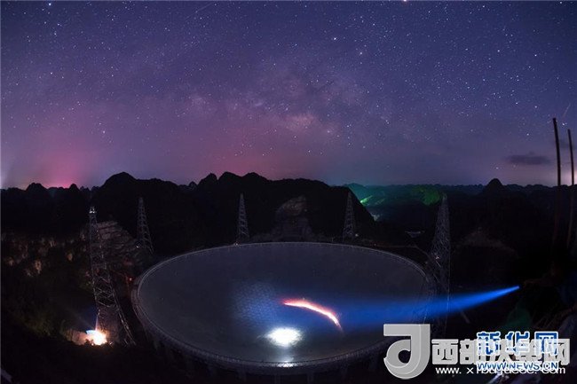 FAST在滿天繁星下呈現(xiàn)出的美麗景觀(2016年6月27日攝)。2017年10月10日,中國科學(xué)院國家天文臺(tái)宣布,被譽(yù)為“中國天眼”的500米口徑球面射電望遠(yuǎn)鏡(FAST)經(jīng)過一年緊張調(diào)試,已實(shí)現(xiàn)指向、跟蹤、漂移掃描等多種觀測模式的順利運(yùn)行,并確認(rèn)了多顆新發(fā)現(xiàn)脈沖星。新華社記者劉續(xù)攝