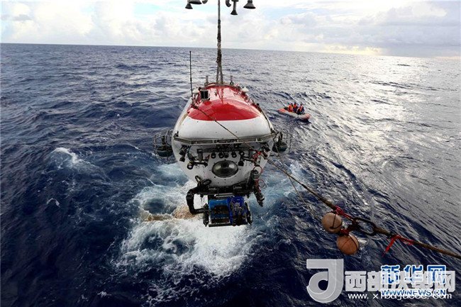 “蛟龍”號(hào)完成下潛后回到“向陽紅09”船甲板(2017年6月13日攝)。新華社記者劉詩平攝