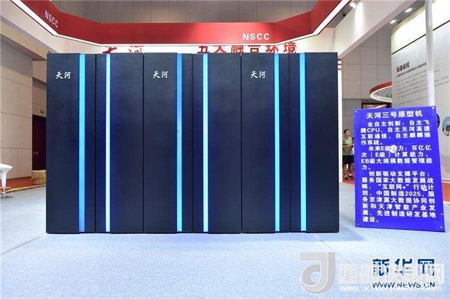 在天津梅江會(huì)展中心展出的我國新一代百億億次超級(jí)計(jì)算機(jī)“天河三號(hào)”原型機(jī)(2018年5月17日攝)。新華社記者李然攝