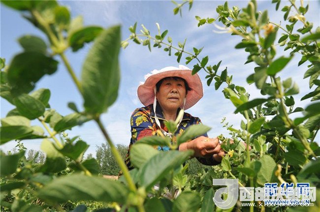 5月27日,河北省吳橋縣鐵城鎮(zhèn)雙井王村農(nóng)民采摘金銀花。