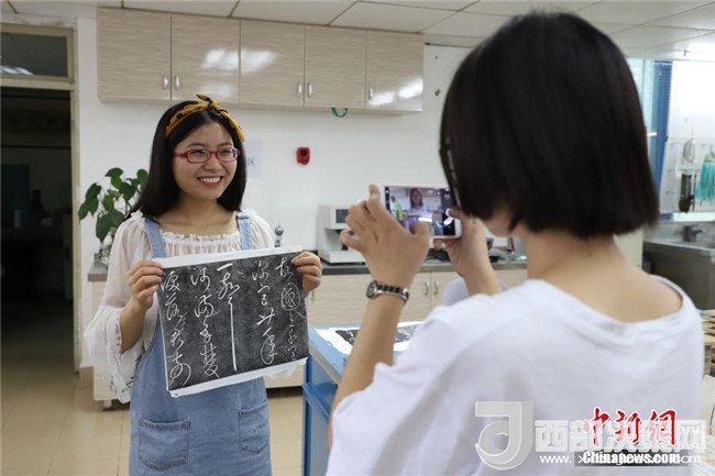 6月9日,一位女同學(xué)與自己的拓片作品合影。當(dāng)日,貴州省古籍保護(hù)中心在貴州省圖書館舉辦“古籍修復(fù)技藝體驗(yàn)”活動(dòng)。活動(dòng)開展了古籍修復(fù)、碑文傳拓等技藝體驗(yàn)。眾多高校師生和民眾紛紛前往體驗(yàn)。中新社發(fā)瞿宏倫攝