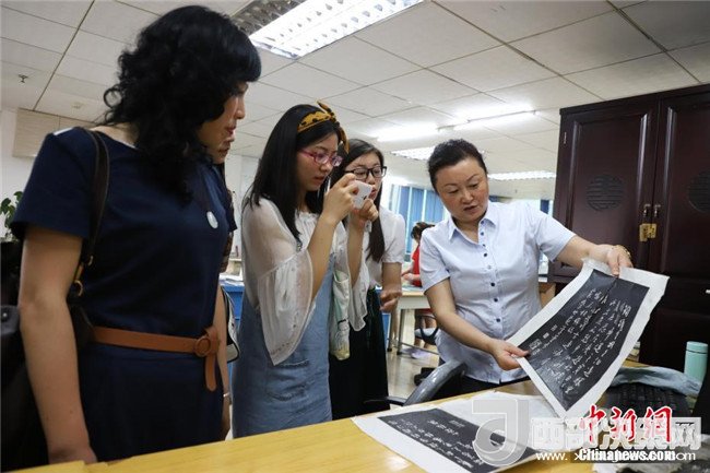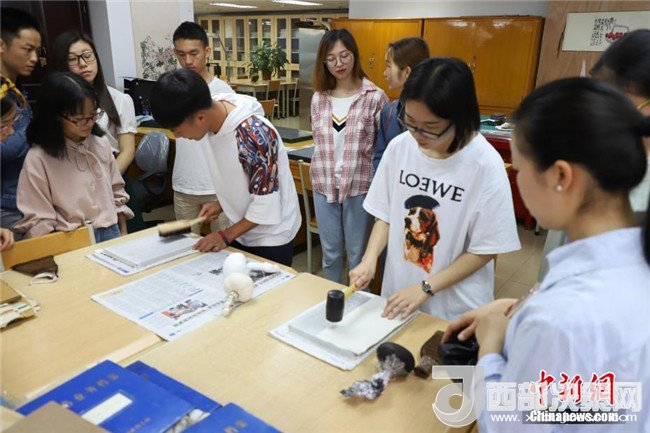 兩位同學(xué)在正在體驗(yàn)碑文的傳拓技藝。中新社發(fā)瞿宏倫攝