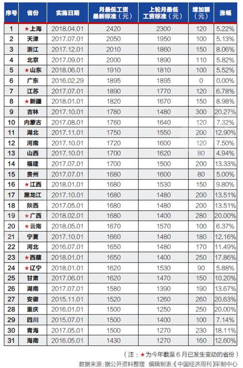 據(jù)記者不完全統(tǒng)計,截至6月6日,全國已有山東、上海、新疆、遼寧、江西、西藏、廣西和云南等8個省區(qū)市上調(diào)了2018年最低工資標(biāo)準(zhǔn)。自2016年以來,已有29個省份上調(diào)了最低工資標(biāo)準(zhǔn),至今未調(diào)整的是四川省和安徽省。不過,這兩個省也已經(jīng)明確表示今年將提高最低工資標(biāo)準(zhǔn),如果順利實施,意味著今年上調(diào)最低工資標(biāo)準(zhǔn)的地方已經(jīng)擴(kuò)容至10省市。