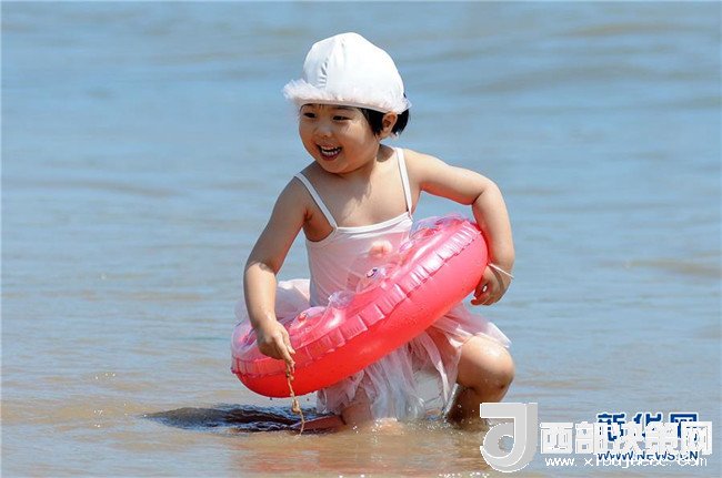7月1日,一名小朋友在山東省青島市第一海水浴場戲水。 新華社發(fā)(王海濱 攝)