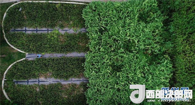 工作人員在蘇州市吳中區(qū)金庭鎮(zhèn)馬家門前治污生態(tài)濕地查看垂直流濾床的運(yùn)行狀況(7月4日無人機(jī)拍攝)。