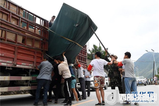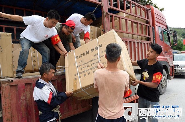 7月15日,在舟曲縣南峪鄉(xiāng),志愿者及村民從車輛上搬運(yùn)救災(zāi)物資。
