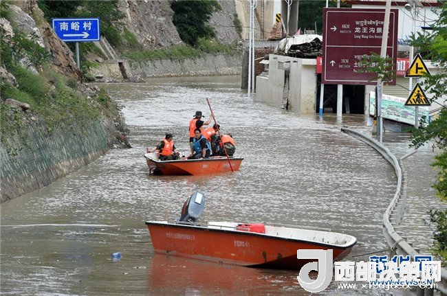 7月15日,在舟曲縣南峪鄉(xiāng),工作人員乘坐沖鋒舟開展險(xiǎn)情處置。