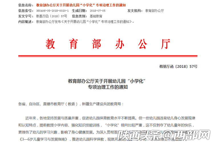 日前,教育部辦公廳發(fā)布了《關于開展幼兒園“小學化”專項治理工作的通知》,通知要求各地應開展專項治理,嚴禁幼兒園教授小學課程內容,對于提前教授漢語拼音、識字、計算、英語等小學課程內容的,要堅決予以禁止。
