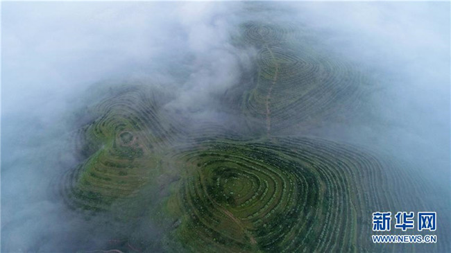 云霧繚繞的寧夏彭陽縣金雞坪梯田公園(7月17日無人機拍攝)。新華社記者王鵬攝