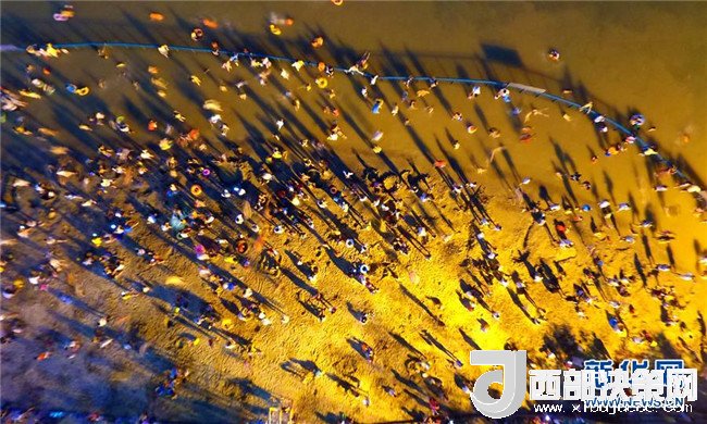 7月18日,市民在廣西柳州市金沙角人工沙灘上戲水消暑(無人機(jī)拍攝)。