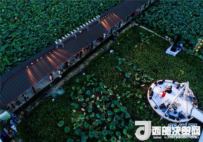 樂隊組合在浙江省建德市大慈巖鎮(zhèn)里葉村荷田間的舞臺上進(jìn)行演奏(7月14日無人機(jī)拍攝)。新華社記者 徐昱 攝