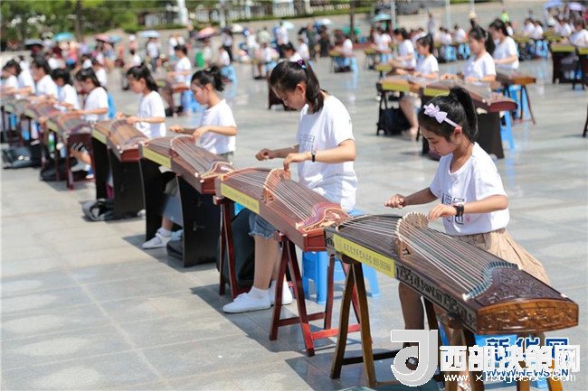 7月29日,人們在甘肅平?jīng)鲠轻脊沛?zhèn)彈奏古箏。當日,甘肅省平?jīng)鍪嗅轻脊沛?zhèn)舉行第二屆“百人箏會”,300余人共同彈奏古箏,演繹《荷塘月色》《漁舟唱晚》等曲目,聲聲悅耳,場面震撼。新華社發(fā)(鄭兵攝)