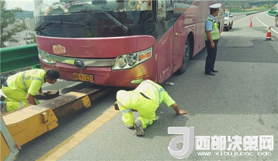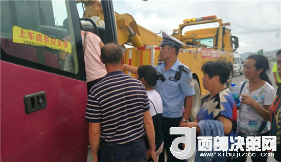 西部決策網(wǎng)-西部大開(kāi)發(fā)訊(記者帥華鋒 通訊員 馬存福 蘇娟)7月31日上午,甘肅西和縣公安局交警大隊(duì)高速中隊(duì)執(zhí)勤民警巡邏至十天高速西和段上行線(xiàn)天水方向(西和隧道附近),發(fā)現(xiàn)一輛大客車(chē)停靠在路邊,當(dāng)時(shí)高速行駛的車(chē)輛川流不息,車(chē)輛沒(méi)有停放在安全地帶,存在著極大的安全隱患。民警上前立即查看情況,發(fā)現(xiàn)車(chē)輛故障,67名乘客被困于高速,乘客大多數(shù)為婦女與兒童,由于天氣炎熱,長(zhǎng)時(shí)間困于車(chē)輛中,情緒焦急不安,存在諸多不安全因素,見(jiàn)此情況,民警立即在故障車(chē)輛兩百米外設(shè)置安全提示牌,擺放錐桶,現(xiàn)場(chǎng)指揮過(guò)往車(chē)輛,提醒車(chē)輛減速慢行,做好防護(hù)的同時(shí),利用巡邏警車(chē)將車(chē)上乘客有序轉(zhuǎn)移到一公里外的停車(chē)區(qū),積極聯(lián)系高速公路救援中心將故障車(chē)輛進(jìn)行拖移,盡快撤離高速,恢復(fù)交通秩序。