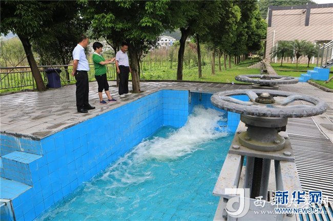 2018年7月15日,貴州興義市桔山河市級河長葛佳華(中)、鎮(zhèn)級河長陳再云(左)和村級河長陳明君在桔山污水處理廠的出水口進(jìn)行巡查。新華社記者 歐東衢 攝