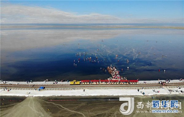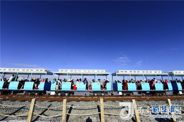 一列景區(qū)觀光火車從茶卡鹽湖景區(qū)內(nèi)經(jīng)過(guò)(8月14日攝)。  新華社記者張宏祥攝