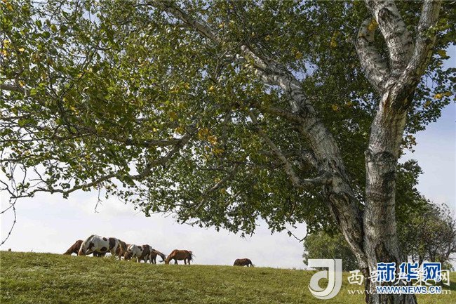 9月1日,兩匹馬在內(nèi)蒙古烏蘭布統(tǒng)草原的樺樹下吃草。
