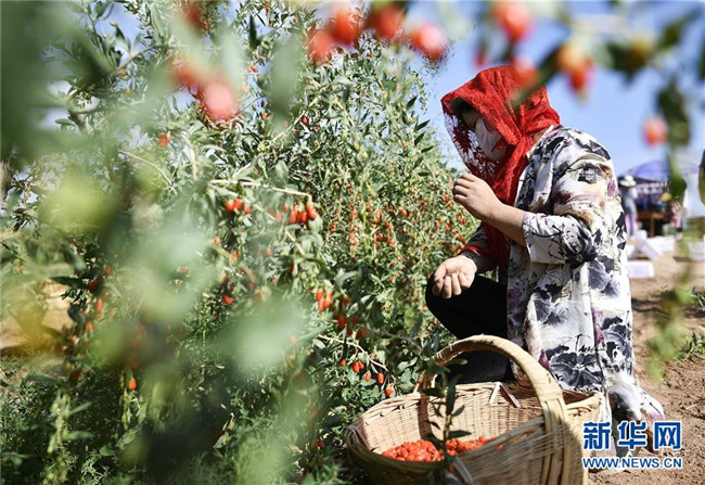 農(nóng)民在寧夏吳忠市同心縣潤德莊園枸杞基地采摘枸杞(6月22日攝)。地處西北內(nèi)陸的寧夏,既有高山大漠的雄渾,又有“塞上江南”的溫婉,自然造化之美自古入詩入畫。自治區(qū)成立60年里,尤其是黨的十八大以來,這片熱土上的人民用勤勞和智慧,發(fā)展特色農(nóng)業(yè)、建設美麗鄉(xiāng)村、樹立文明鄉(xiāng)風,繪就一幅全新、壯美的鄉(xiāng)村振興新畫卷。新華社記者王鵬攝