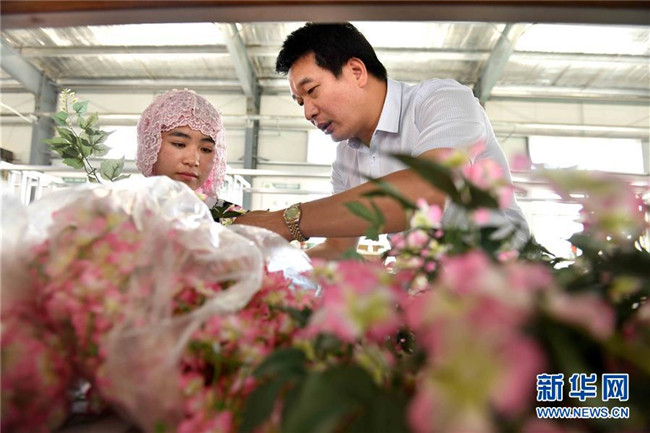 潘文賢(右)在寧夏固原市隆德縣隆德人造花工藝有限公司向員工介紹人造花制作技術(8月29日攝)。來自福建南安市的潘文賢2011年在隆德縣創(chuàng)辦隆德人造花工藝有限公司,成為隆德縣第一家集研發(fā)、生產(chǎn)和銷售于一體的勞動密集型出口創(chuàng)匯企業(yè),產(chǎn)品遠銷歐美及東南亞等國家和地區(qū)。截至2017年底,已成功打造隆德縣前莊村、紅崖社區(qū)等5個扶貧車間,幫助150人穩(wěn)定就業(yè)、218戶外加工戶靈活增收,帶動300多個建檔立卡戶增收脫貧。 新華社記者郭緒雷攝