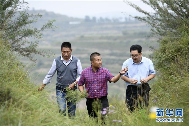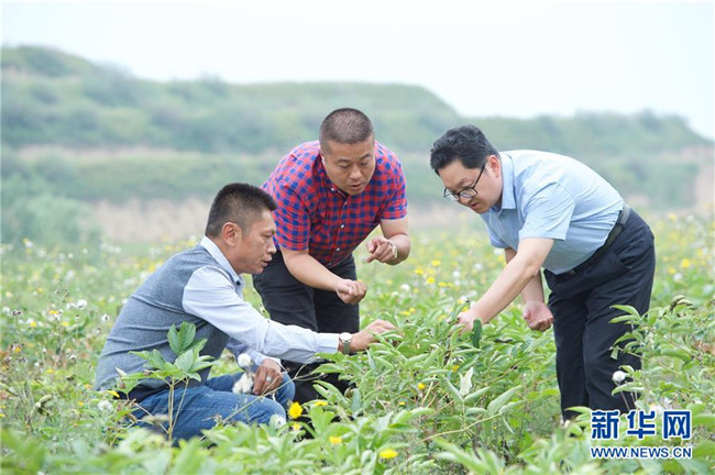 來自福建長樂的林錦云(中)在寧夏固原市河川鄉(xiāng)與福建對口支援農(nóng)業(yè)專家(右)交流牡丹種植技術(8月28日攝)。2014年,林錦云通過土地流轉(zhuǎn)方式,承包了河川鄉(xiāng)1.5萬畝荒山,打造油用牡丹生產(chǎn)基地。目前,林錦云種下的7600畝油用牡丹已經(jīng)開始產(chǎn)生效益,公司已就近吸納村民300多人就業(yè),其中建檔立卡戶39戶,人均年收入2萬多元。 新華社記者姜克紅攝
