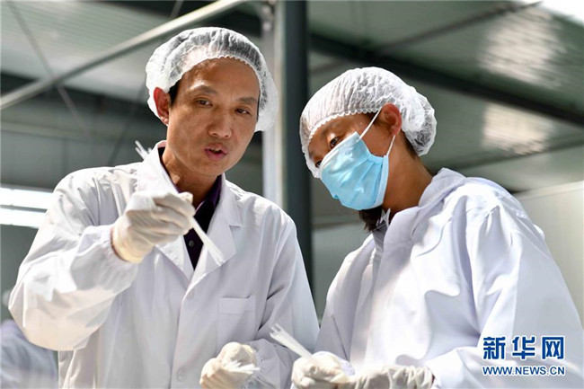 黃玉仁(左)在寧夏固原市隆德縣寧夏黃土地農(nóng)業(yè)食品有限公司與員工交流馬鈴薯粉絲制作技術(8月29日攝)。來自福建莆田的黃玉仁2017年在隆德縣創(chuàng)辦寧夏黃土地農(nóng)業(yè)食品有限公司,利用當?shù)伛R鈴薯種植優(yōu)勢,制作馬鈴薯深加工產(chǎn)品,促進當?shù)伛R鈴薯銷售和農(nóng)民增收。目前公司已建成4條生產(chǎn)線,為當?shù)?0多名百姓解決就業(yè)。 新華社記者郭緒雷攝