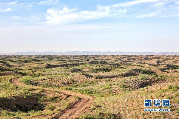 通過“麥草方格”模式組成的“沙帳植物帶”。新華網(wǎng)陳延特攝