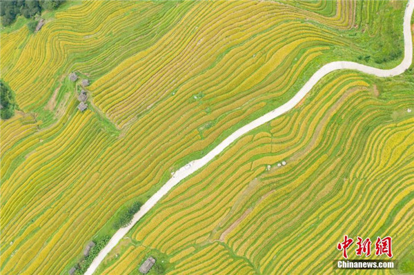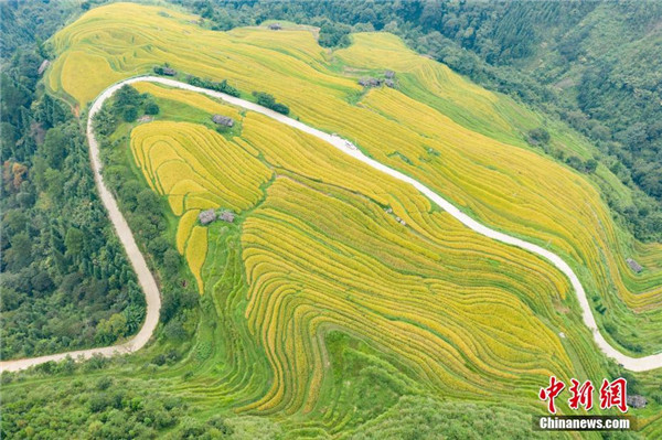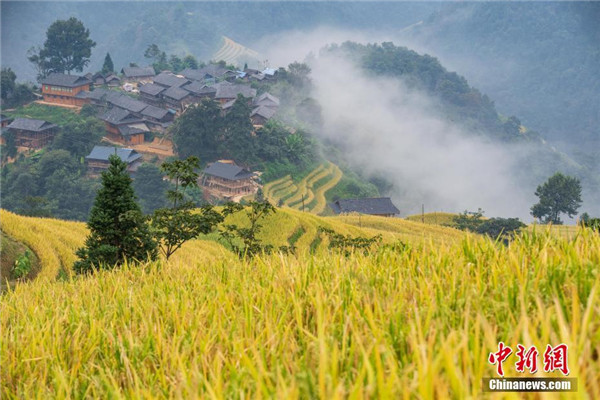 遠眺貴州省榕江縣陽開梯田秋色,金黃的水稻與苗寨相映成趣。 中新社記者 賀俊怡 攝