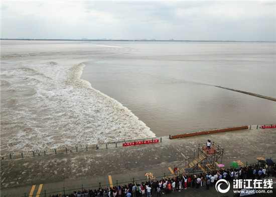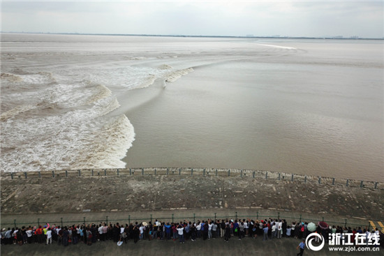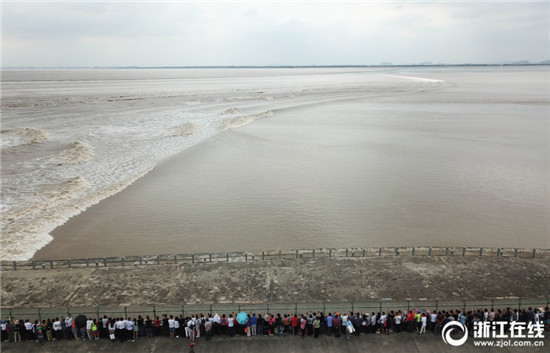 9月26日,農(nóng)歷八月十七,海寧大缺口觀潮點(diǎn),千名游客在江堤上安全觀潮。據(jù)海寧鹽官水文站預(yù)測(cè),從當(dāng)天開始,錢塘江進(jìn)入最佳觀潮期,預(yù)計(jì)八月十八大潮日,潮高會(huì)在1.5米左右。(浙江在線記者 董旭明 攝)