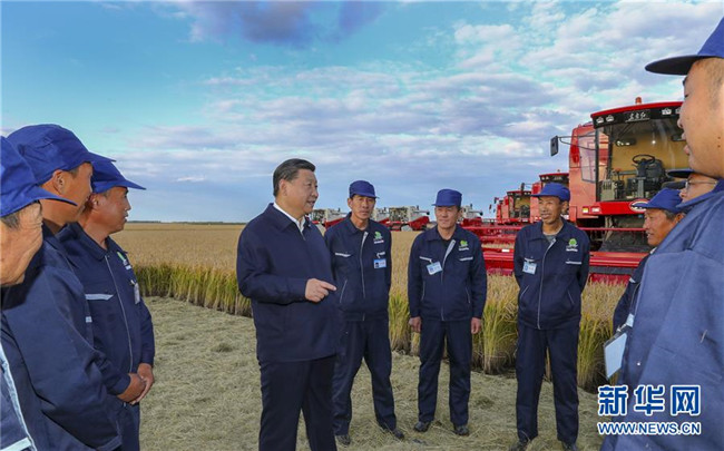 9月25日至28日,中共中央總書記、國家主席、中央軍委主席習(xí)近平在東北三省考察,主持召開深入推進(jìn)東北振興座談會。這是25日下午,習(xí)近平在黑龍江農(nóng)墾建三江管理局七星農(nóng)場萬畝大地號與農(nóng)場工人們親切交談。 新華社記者 謝環(huán)馳 攝