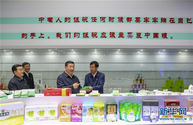 在一樓展示大廳,當(dāng)?shù)爻霎a(chǎn)的米油豆奶等各類農(nóng)產(chǎn)品琳瑯滿目,習(xí)近平逐一察看,強(qiáng)調(diào)中國人的飯碗任何時(shí)候都要牢牢端在自己的手上。他雙手捧起一碗大米,意味深長地說道:“中國糧食!中國飯碗!”